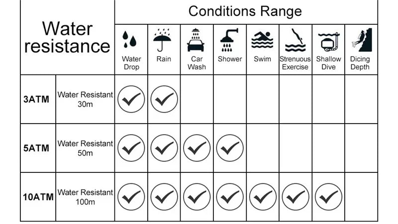 6. 3 ATM water resistant, perfect waterproof like washing hand/sweat/rain, but can not put into water or shower or swim.