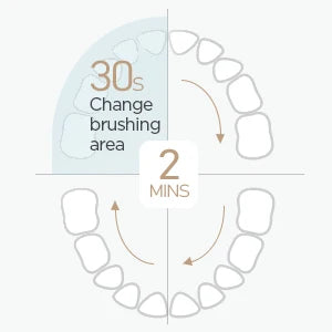 A 2 Minutes Smart Timer with interval pausing every 30 seconds encourages a good brushing habits.