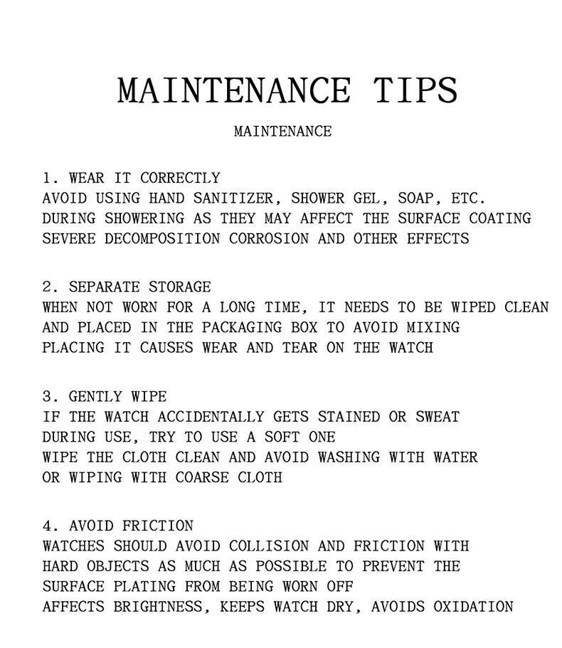 4. anti-collision oxidation: Keep away from hard object collisions, keep the watch dry, and prevent surface plating wear and oxidation.